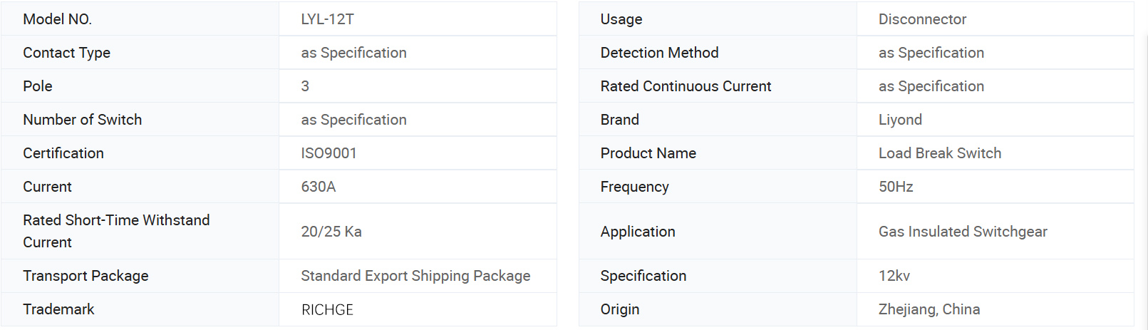 লিল -12 টি লোড সুইচ GB3804-2004 "3.6KV ~ 40.5KV উচ্চ ভোল্টেজ এসি লোড সুইচ" এবং GB16926-1997 "এসি উচ্চ ভোল্টেজ লোড সুইচ-ফিউজ সংমিশ্রণ অ্যাপ্লায়েন্স" এর প্রাসঙ্গিক প্রয়োজনীয়তা মেনে চলে। প্রধান সার্কিট: 630A-20KA (4 এস), 25 কেএ (3 এস); যান্ত্রিক জীবন: 5000 বার; গ্রাউন্ডিং সার্কিট: 20 কেএ (2 এস); যান্ত্রিক জীবন: 2000 বার।