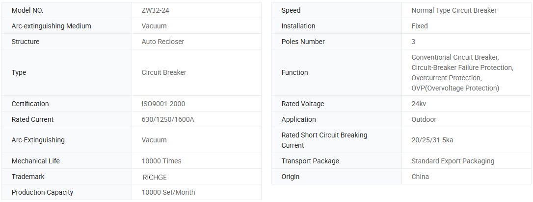 জেডডাব্লু 32-24 আউটডোর এসি উচ্চ-ভোল্টেজ ভ্যাকুয়াম সার্কিট ব্রেকার (এরপরে সার্কিট ব্রেকার হিসাবে উল্লেখ করা হয়) 24 কেভি, 50Hz থ্রি-ফেজ এসি আউটডোর পাওয়ার বিতরণ সরঞ্জামের ভোল্টেজ রেট করা হয়।