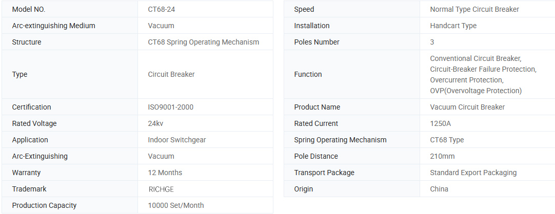 মডেল সিটি 68 -24 ইনডোর ভ্যাকুয়াম সার্কিট ব্রেকার সিটি 68 স্প্রিং অপারেটিং মেকানিজমের সাথে ব্যবহার করুন। এটি তিন-পর্যায়ের এসি, 50 হার্জ ইনডোর পাওয়ার ডিট্রিবিউশন সরঞ্জাম 24 কেভি ভোল্টেজ সহ।