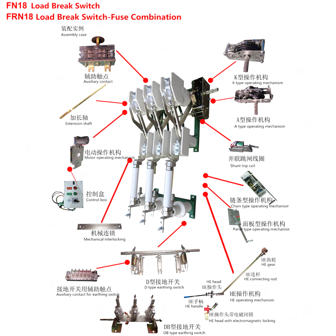 এফএন 18 লোড সুইচ এবং লোড সুইচ-ফিউজ সংমিশ্রণগুলি হ'ল উচ্চ-ভোল্টেজ, উচ্চ-পারফরম্যান্স লোড সুইচগুলি সংমিশ্রণ-এয়ার অর্ক নিভে যাওয়া এবং গ্যাস-উত্পাদিত আর্ক নিভে যাওয়া সংমিশ্রণ করে। লোড স্যুইচ এবং ফিউজের সংমিশ্রণটি ফিউজের সাথে লোড স্যুইচটির সুবিধাগুলিকে একত্রিত করে লোড স্যুইচটির রেট ব্রেকিং কারেন্ট পর্যন্ত যে কোনও লোড কারেন্ট স্যুইচ করতে এবং ফিউজের অপারেশন এবং এর প্রতিবন্ধকতা দ্বারা সংমিশ্রণের সংমিশ্রণের রেটযুক্ত শর্ট-সার্কিট ব্রেকিং কারেন্ট পর্যন্ত যে কোনও অতিরিক্ত পরিবর্তন করে স্যুইচ করতে।