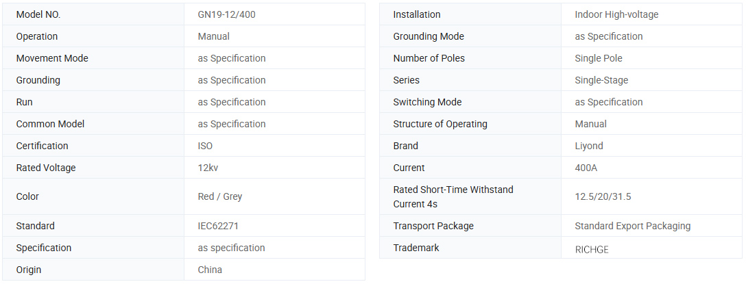 জিএন 19-12 (সি) ইনডোর এইচভি সংযোগ বিচ্ছিন্ন স্যুইচ রেটেড ভোল্টেজ 12 কেভি, এসি 50/60Hz এর পাওয়ার সিস্টেমে প্রযোজ্য। এটি CS6-1 ম্যানুয়াল-অপারেটিং প্রক্রিয়া দিয়ে সজ্জিত এবং কোনও লোডের অধীনে সার্কিটটি ভাঙতে এবং তৈরি করতে ব্যবহৃত হয়। অতিরিক্ত দূষণের ধরণ, উচ্চ-উচ্চতার ধরণ এবং শক্তি নির্দেশক প্রকার রয়েছে। এটি আইইসি 62271-102 অনুসারে তৈরি করা হয়েছে।