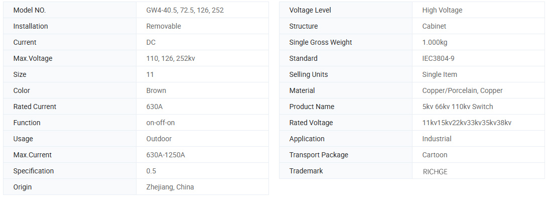GW4-12 (40.5) আউটডোর এসি উচ্চ ভোল্টেজ সংযোগ বিচ্ছিন্ন স্যুইচ (সংক্ষিপ্ত জন্য সংযোগ বিচ্ছিন্ন স্যুইচ) ভোল্টেজ সহ সার্কিটটি খোলার এবং বন্ধ করতে ব্যবহৃত হয় তবে কোনও লোড 50/0Hz, 12 (40.5) কেভি পাওয়ার সিস্টেম। এটি আইইসি 129-1984 এসি সংযোগ বিচ্ছিন্ন স্যুইচ এবং আর্থিং সুইচ এবং জিবি 1985 এবং অন্যান্য আপেক্ষিক মানগুলির মানগুলির সাথে সম্মতি দেয়।