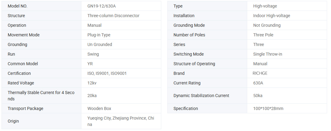 জিএন 19-12 (সি) সিরিজ ইনডোর এসি উচ্চ ভোল্টেজ বিচ্ছিন্নতা সুইচ এসি 50Hz, রেটেড ভোল্টেজ 12 কেভি এবং পাওয়ার সিস্টেমের নীচে উপযুক্ত, এটি সিএস 6-1 ম্যানুয়াল-অপারেটিং প্রক্রিয়া দিয়ে সজ্জিত এবং কোনও লোডের অধীনে সার্কিটটি ভাঙ্গতে এবং তৈরি করতে ব্যবহৃত হয়। অতিরিক্ত দূষণের ধরণ, উচ্চ-উচ্চতার ধরণ এবং শক্তি নির্দেশক প্রকার রয়েছে। এটি আইইসি 62271-102 অনুসারে তৈরি করা হয়েছে। ভোল্টেজের শর্তে বৈদ্যুতিক সরঞ্জামগুলি স্যুইচ করার জন্য ব্যবহৃত হয় তবে কোনও লোড নেই, সেখানে অ্যান্টি-ফাউলিং টাইপ, মালভূমি টাইপ এবং লাইভ ডিসপ্লে ডিভাইসগুলি ইনস্টল করা যেতে পারে এমনও প্রেরণ করা হয়। জিএন 19-12 সিরিজ ইনডোর উচ্চ ভোল্টেজ বিচ্ছিন্ন সুইচ 12 কেভি এবং তিন-পর্যায়ের এসি 50Hz এর রেটযুক্ত ভোল্টেজ সহ একটি ইনডোর ডিভাইস।