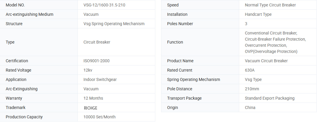 ভিএসজি -12 1600A স্থির ধরণের উচ্চ-ভোল্টেজ ভ্যাকুয়াম সার্কিট ব্রেকার 12 কেভি পাওয়ার সিস্টেমে ব্যবহৃত একটি ইনডোর এবং আউটডোর স্যুইচিং ডিভাইস। এটি বিদ্যুৎ গ্রিড সরঞ্জাম এবং শিল্প ও খনির উদ্যোগের পাওয়ার ডিজাইনের জন্য সুরক্ষা এবং নিয়ন্ত্রণ ইউনিট হিসাবে ব্যবহৃত হয়। এটি বিভিন্ন স্বভাব এবং ঘন ঘন অপারেশনগুলির বোঝা স্যুইচ করার জন্য উপযুক্ত। প্রথমবারের জন্য শর্ট সার্কিট কারেন্ট ভাঙার উপলক্ষ। পণ্যটি ভিএসজি মডিউল ইন্টিগ্রেটেড স্প্রিং অপারেটিং মেকানিজম গ্রহণ করে। ভিএসজি -12 এর প্রাথমিক অংশটি ভ্যাকুয়াম আর্ক নিভে যাওয়া যন্ত্র এবং মূল পরিবাহী সার্কিট অংশগুলি সামগ্রিকভাবে সিল করার জন্য একটি সিলযুক্ত মেরু ব্যবহার করতে পারে, সংঘর্ষ, ধূলিকণা এবং ঘনীভবন থেকে অর্ক নিভে যাওয়া যন্ত্রটিকে রক্ষা করে। এটিতে শক্তিশালী পরিবেশগত অভিযোজনযোগ্যতা রয়েছে এবং এআরসি নিভে যাওয়া যন্ত্র, অপারেশন এবং রক্ষণাবেক্ষণের ব্যয়কে ব্যাপকভাবে হ্রাস করে।
