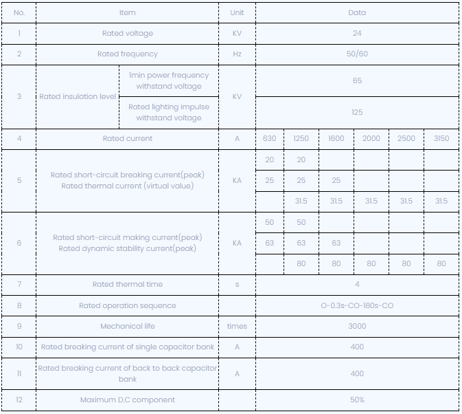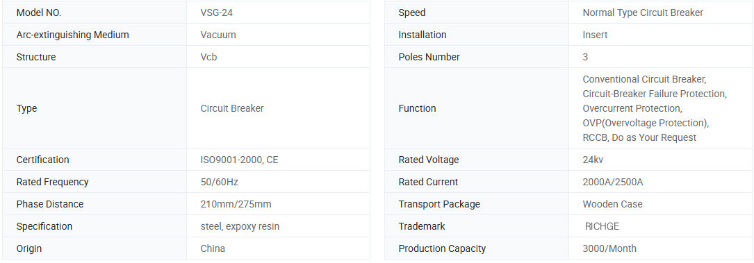 এম্বেডড মেরুগুলির সাথে ইনডোর হাই ভোল্টেজ ভ্যাকুয়াম সার্কিট ব্রেকার এর ভিএসজি -২৪ সিরিজটি ২৪ কেভি রেটেড ভোল্টেজ সহ তিন ধাপের এ.সি. 50Hz ইনডোর পাওয়ার বিতরণ সরঞ্জামাদি। এটি শিল্প ও মিং এন্টারপ্রাইজ, বিদ্যুৎকেন্দ্র এবং সাবস্টেশন ক্ষেত্রে বৈদ্যুতিক সরঞ্জামগুলি রক্ষা এবং নিয়ন্ত্রণ করার জন্য ব্যবহৃত হয়।