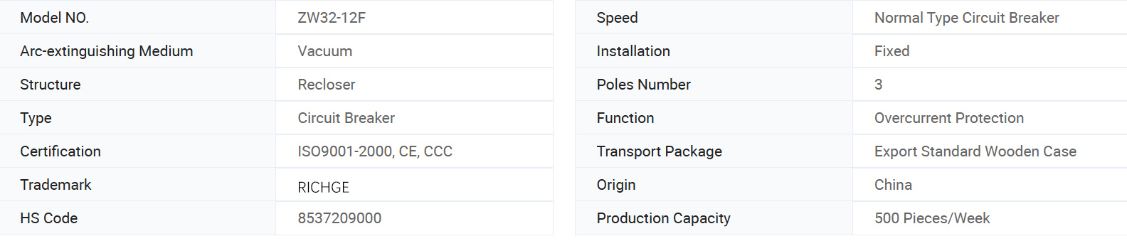 জেডডাব্লু 32-12 সিরিজ আউটডোর এসি হাই-ভোল্টেজ ভ্যাকুয়াম সার্কিট ব্রেকাররা জিবি 1984 "এসি হাই-ভোল্টেজ সার্কিট ব্রেকার" এবং আন্তর্জাতিক ইলেক্ট্রোটেকনিকাল কমিশন আইইসি 60056 "উচ্চ-ভোল্টেজ এসি সার্কিট ব্রেকার" এবং অন্যান্য মানদণ্ডগুলি মেনে চলে।