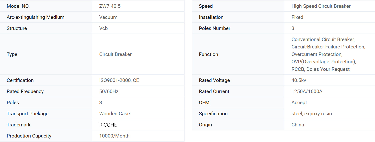 সার্কিট ব্রেকারের প্রধান বৈশিষ্ট্যগুলি হ'ল দুর্দান্ত ব্রেকিং পারফরম্যান্স, ভ্যাকুয়াম আর্ক, উচ্চ ব্রেকিং ক্ষমতা, 10000 বার পর্যন্ত যান্ত্রিক জীবন, সাধারণ কাঠামো, রক্ষণাবেক্ষণ মুক্ত এবং দীর্ঘ রক্ষণাবেক্ষণ চক্র; ভাল নিরোধক কর্মক্ষমতা এবং শক্তিশালী দূষণের ক্ষমতা; বর্তমান ট্রান্সফর্মারগুলি গ্রাহকের প্রয়োজনীয়তা অনুসারে ইনস্টল করা যেতে পারে, 0.2 স্তরের পরিমাপের যথার্থতা সহ, তিন-পর্যায়ের মিথস্ক্রিয়া সক্ষম করে। স্ট্যান্ডার্ড: আইইসি 62271-100